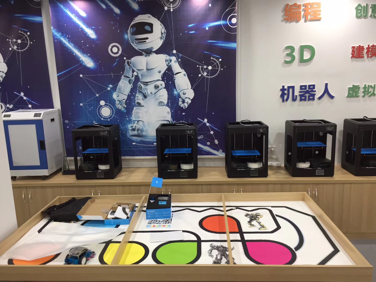 教室实践活动区一共配备了1台大尺寸封闭式3D打印机,5台小尺寸半封闭式3D打印机,28套创客机器人,2套高级机器人,1台无人机等高端机器,同时还配备了多套创客中高级套件,学生工具套件,机器人比赛场地等配套设备。