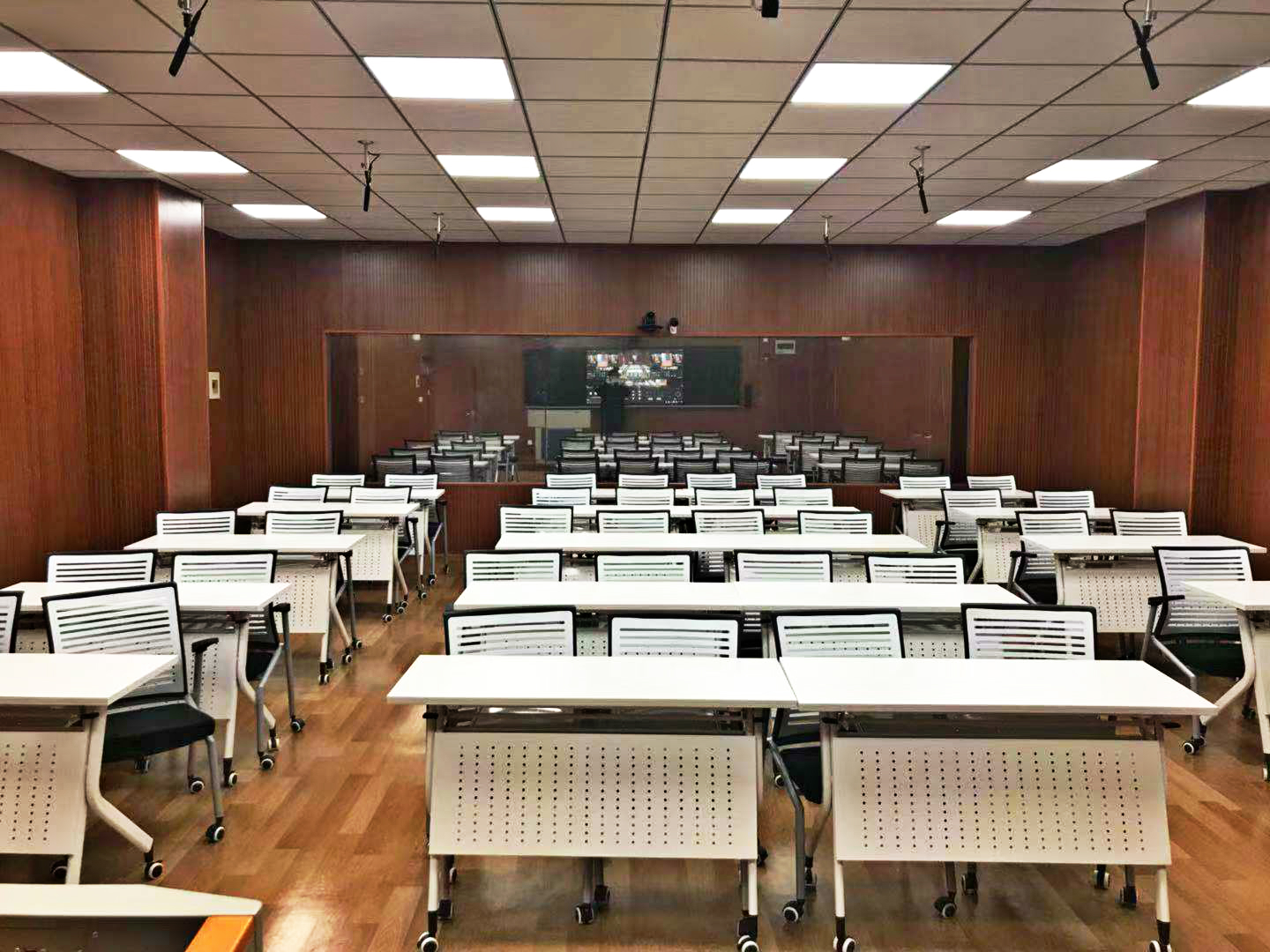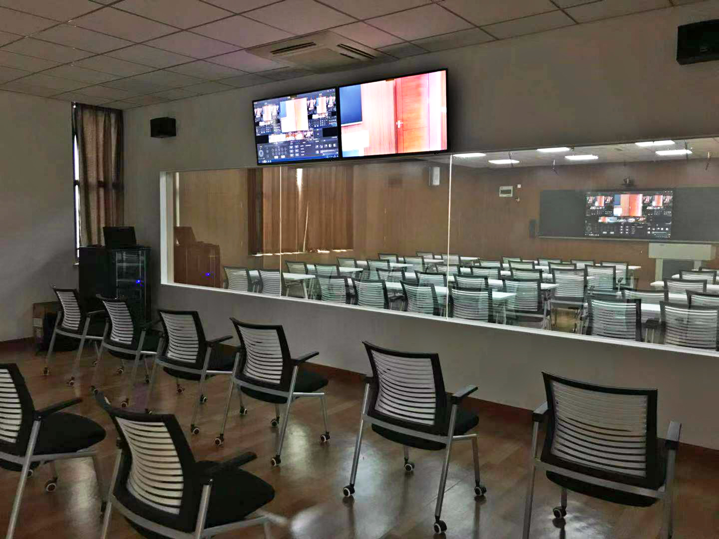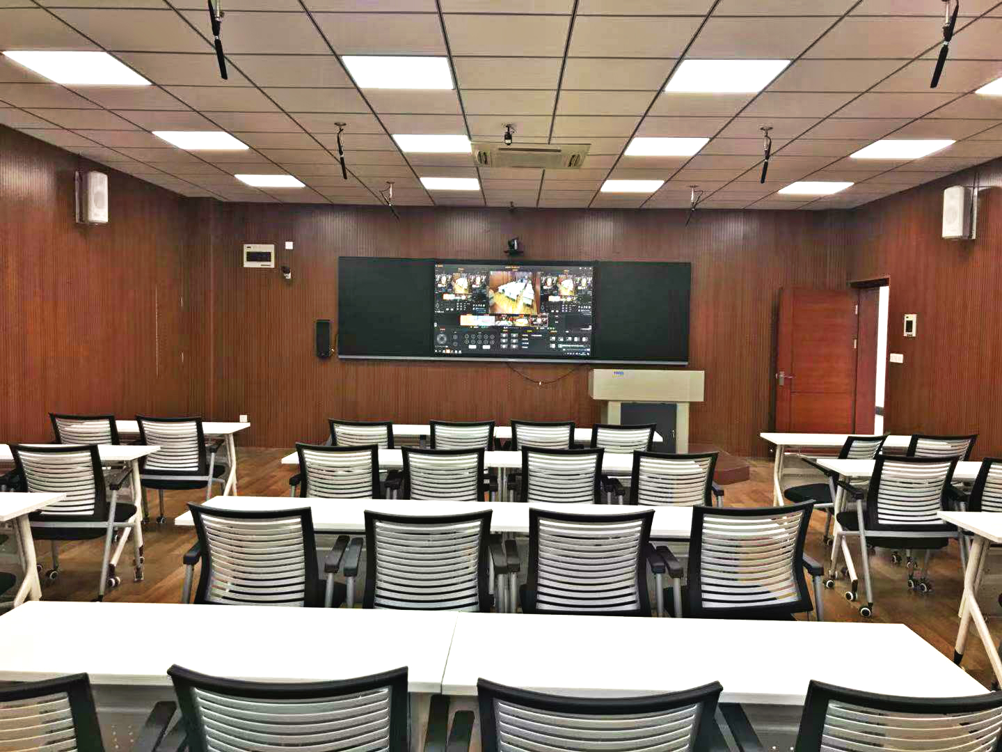 智能录播教室。智能录播教室分为录播区和观摩区,配置了高清智慧互动录播主机、高清云台摄像机、全景摄像机、专业吊装话筒,通过多媒体导播控制平台软件和图像自动跟踪系统软件,实现全程自动切换摄像录播,可进行公开课教学,并可进行实时直播和录播,实现教学资源共享。